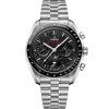 The case in polished-brushed stainless steel is complemented by a polished blue ceramic bezel ring with white enamel tachymeter scale. Fixing the Moonphase watch to the wrist is a bracelet in polished-brushed stainless steel. With patented comfort release adjustment as used on the famous Speedmaster.