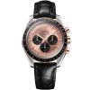 This 42 mm bi-colour model in stainless steel and 18K Moonshine™ Gold features sapphire crystal glass on the front as well as on the caseback. Inspired by the 4th generation Speedmaster style worn on the moon, it includes an asymmetrical case with a black ceramic bezel ring, with its tachymeter scale and famous “dot over ninety” in OMEGA Ceragold™.
