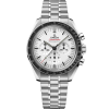 This 42 mm Moonwatch in stainless steel features sapphire crystal glass on the front as well as on the caseback. Inspired by the 4th generation Speedmaster style worn on the moon, it also includes an asymmetrical case, a white lacquered step dial with applied OMEGA logo and indexes, Moonwatch style hands, and the famous dot over 90 on the black anodised aluminium bezel ring.