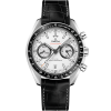 This Speedmaster Racing Master Chronometer model features a 44.25 mm stainless steel case with a black ceramic bezel ring that includes the famous tachymeter scale in orange wording and Liquidmetal™ numbers. The black leather strap is micro-perforated revealing an orange rubber interior.