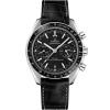 This Speedmaster Racing Master Chronometer model features a 44.25 mm stainless steel case on a brown leather strap with a black ceramic bezel ring that includes the famous tachymeter scale in orange wording and Liquidmetal™ numbers.