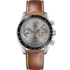 This Speedmaster Racing Master Chronometer model features a 44.25 mm stainless steel case on a black leather strap and a black ceramic bezel ring that includes the famous tachymeter scale in Liquidmetal™