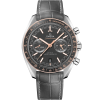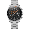 This Speedmaster Racing Master Chronometer model features a 44.25 mm stainless steel case and bracelet with a black ceramic bezel ring that includes the famous tachymeter scale in Liquidmetal™