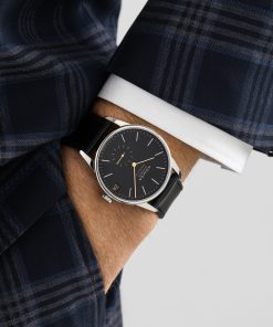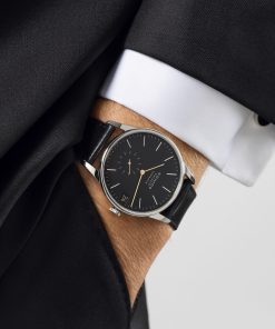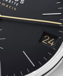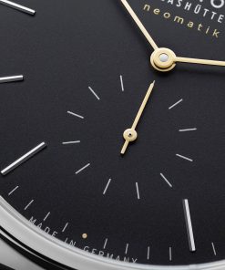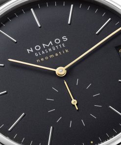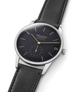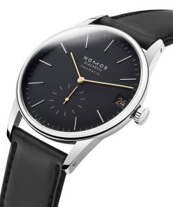 This sophisticated dress watch comes in three sizes (36.4, 38.5, and 40.5 millimeters), showcasing either silver or gold details against a black galvanized dial. They are designed for a comfortable fit, thanks to the ultra-thin automatic calibers DUW 3001 and DUW 6101. The Orion neomatik 41 date new black, the largest model, is remarkably slim at less than 10 millimeters thick. It features a distinctive large date window with gold numerals at the three o’clock position, a signature NOMOS design.