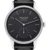 The three new Orion neomatik new black watches from NOMOS Glashütte are a refined version of the classic Orion, featuring a black, curved dial and a sleek stainless steel case. Two of the versions have a unique design where the seconds are shown on a small sub-dial integrated into the main dial.