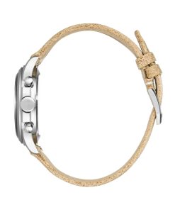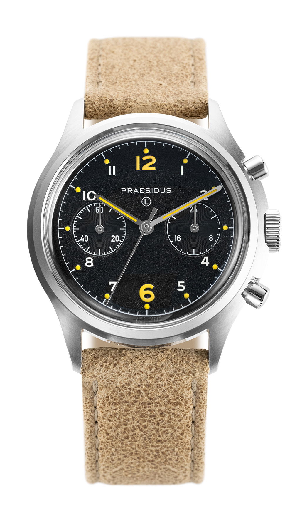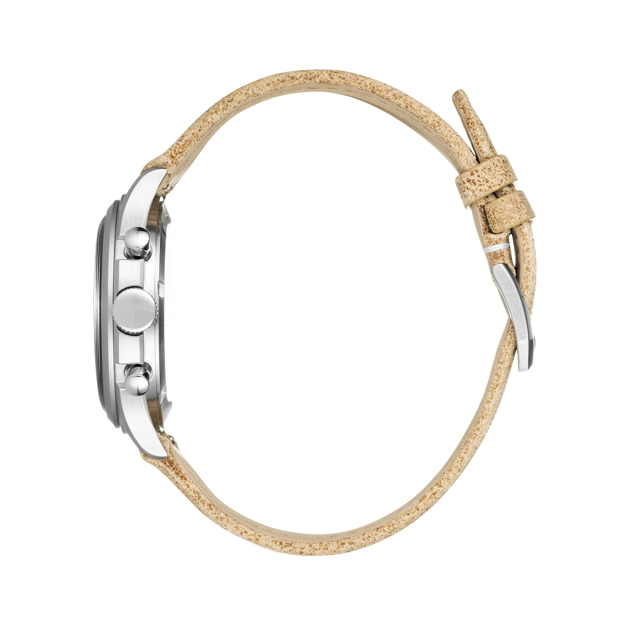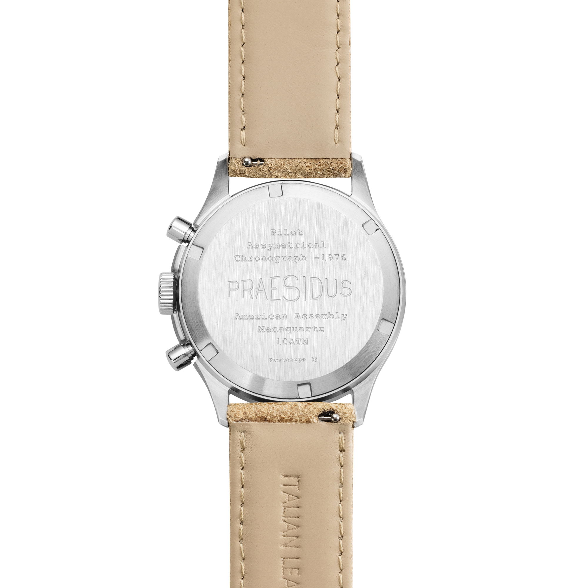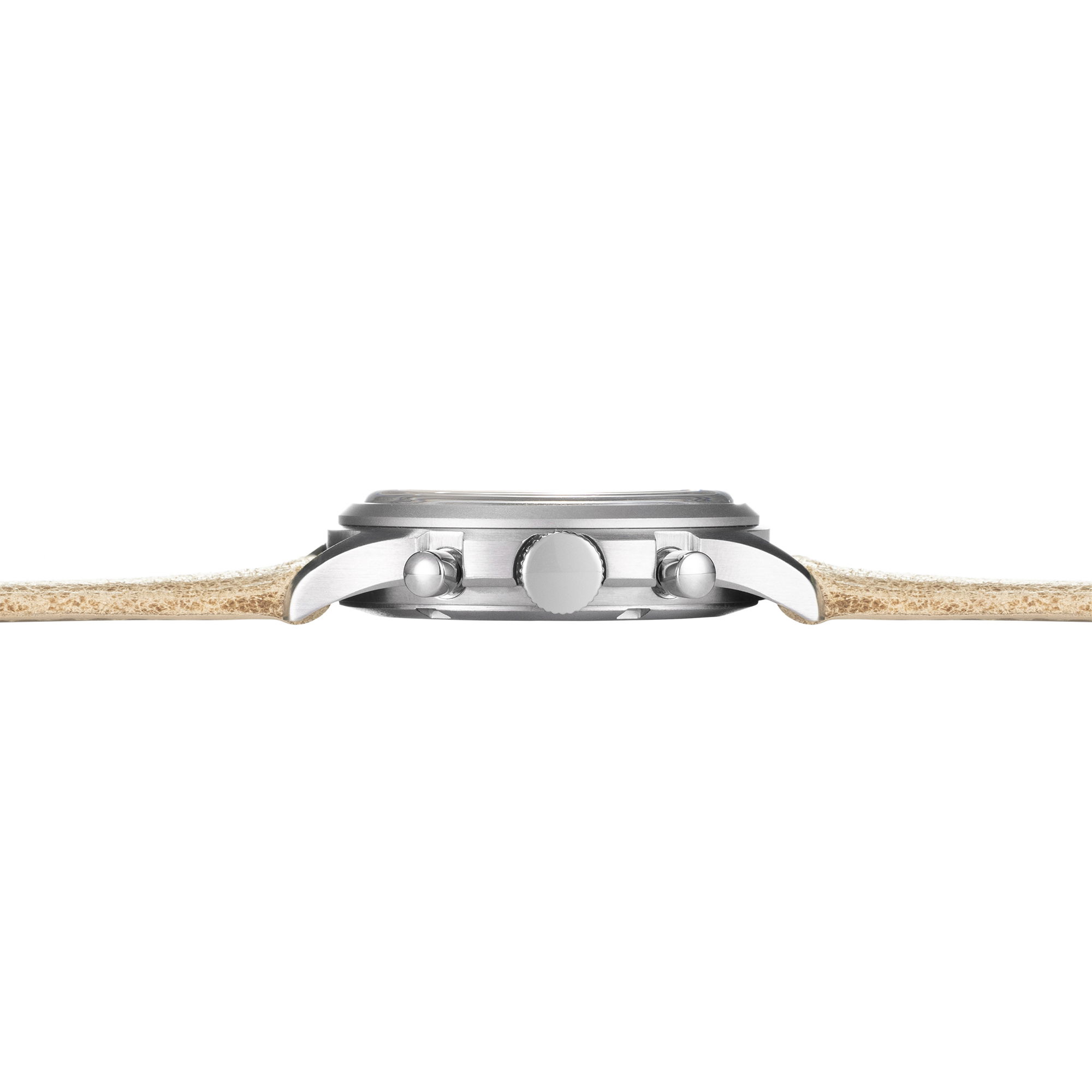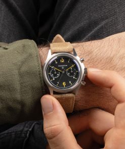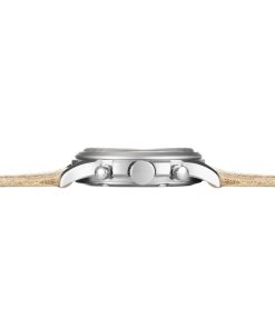 The sand colored distressed leather strap offers a modern take on the classic straps used in original military chronographs. One of the best features is that the strap will acquire a unique patina over time, adding to its character with wear.