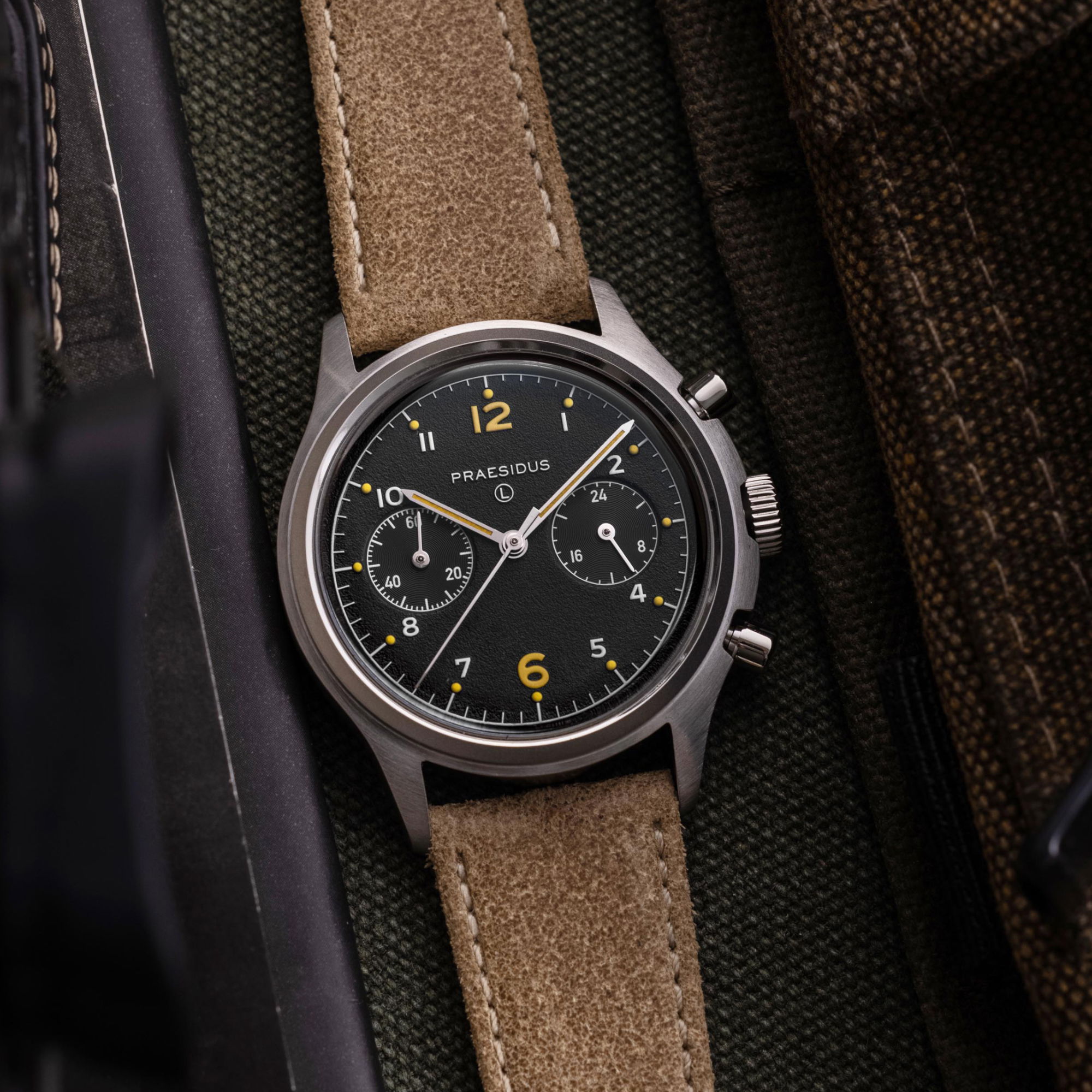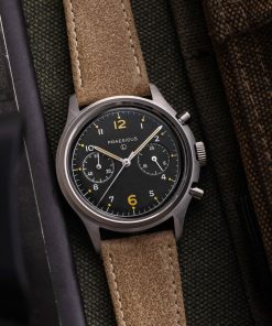 The PAC-76 is a modern revival of 1970s military analog chronographs, featuring oversized 12 and 6 indexes for improved legibility and a vintage aesthetic. This watch pays homage to the bi-compax chronographs used by the USAF and RAF, which pilots relied on for calculating speed, fuel consumption, and navigation.