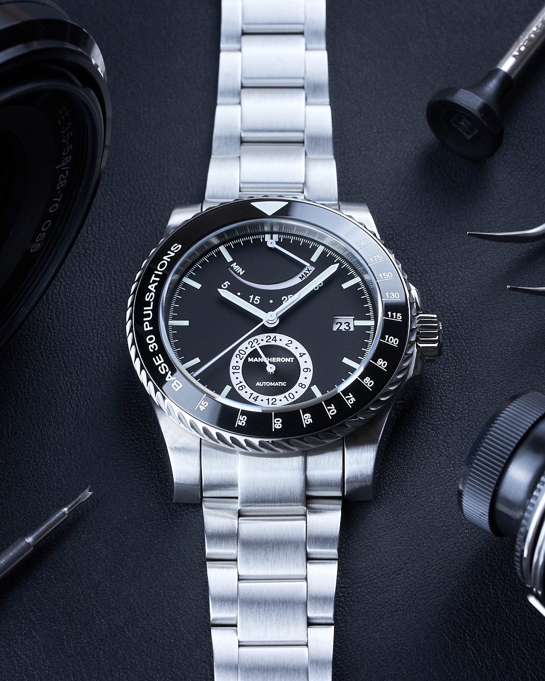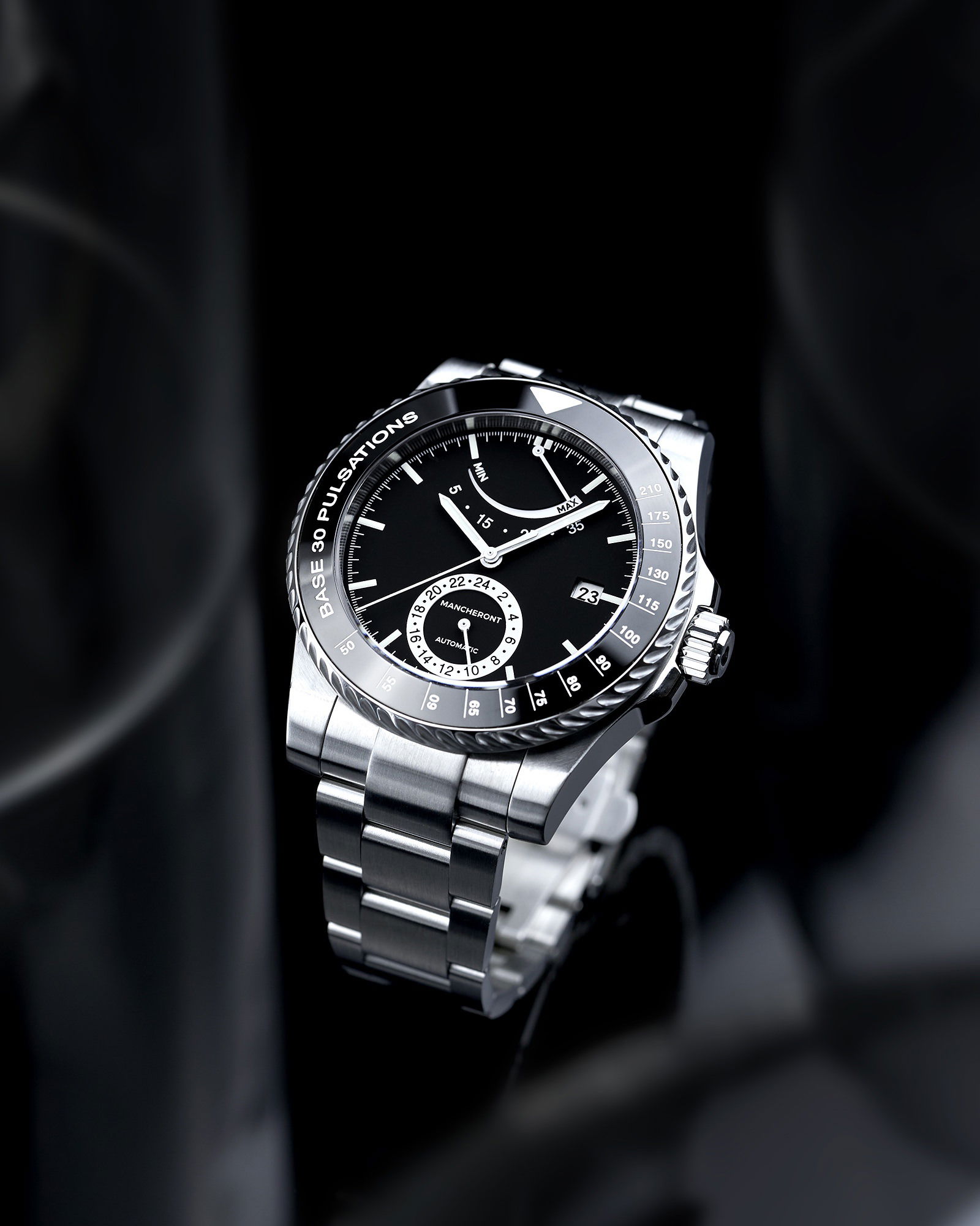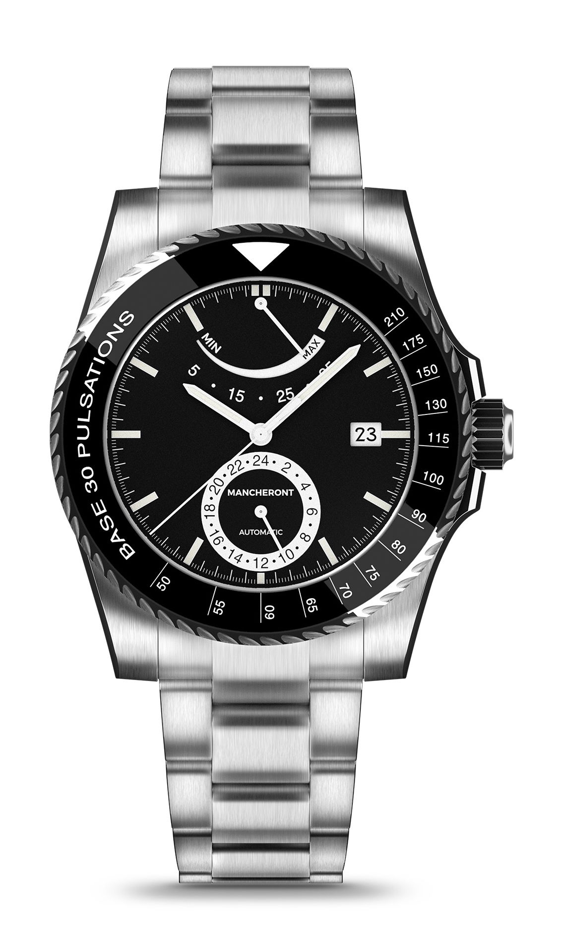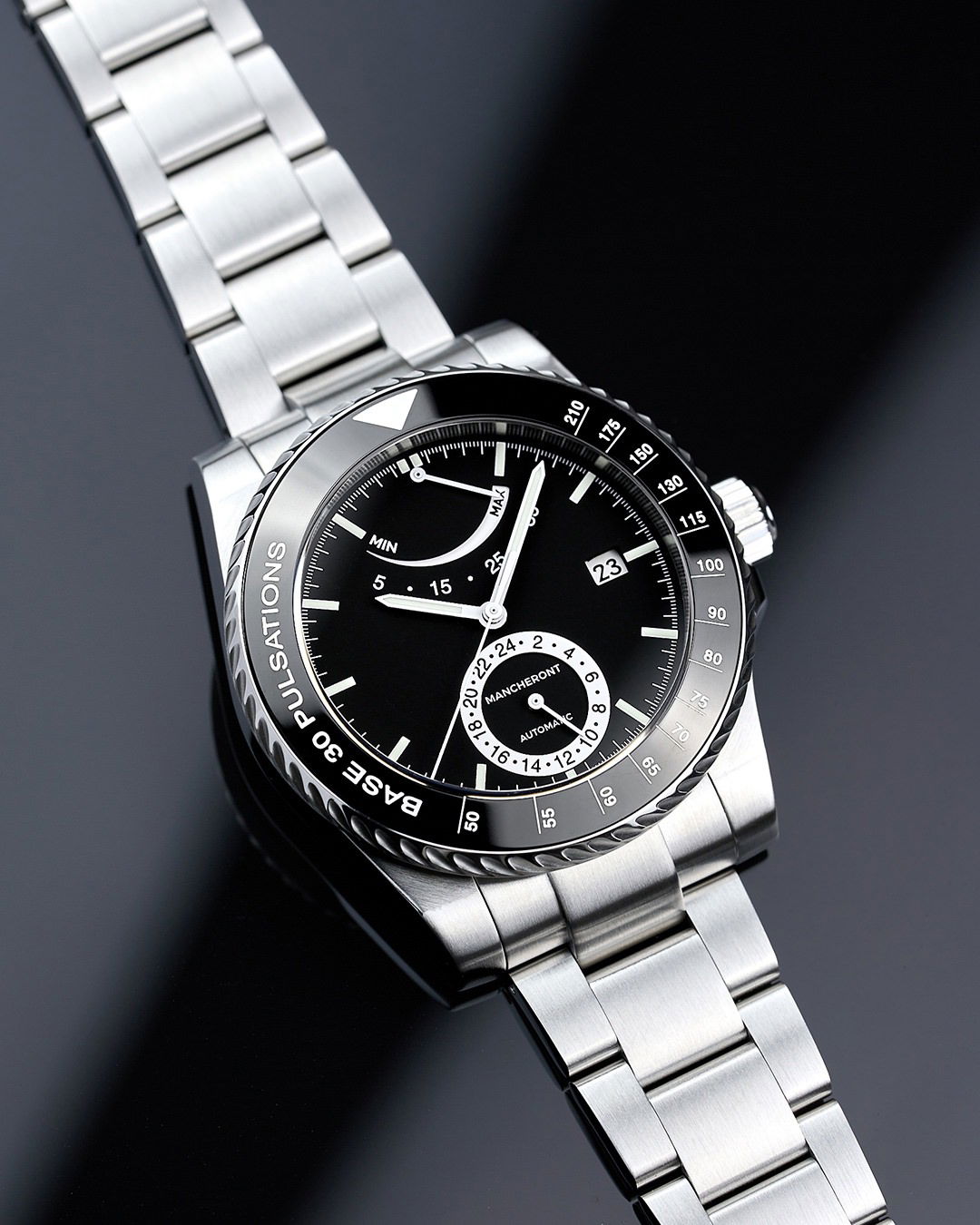 Mancheront introduces the Pacer Black, a contemporary take on the pulsometer watch. This stylish timepiece lets you check your heart rate analogically by rotating the bezel. It simplifies heart rate monitoring by using a pulsometer scale on the dial on a rotatable bezel calibrated for 30 pulsations. The Pacer Black focuses on essentials, forgoing a chronograph for a pulsometer-equipped rotating bezel. Its 316L stainless steel case is 41mm in diameter and comes with a robust 20mm lug-width stainless steel bracelet.