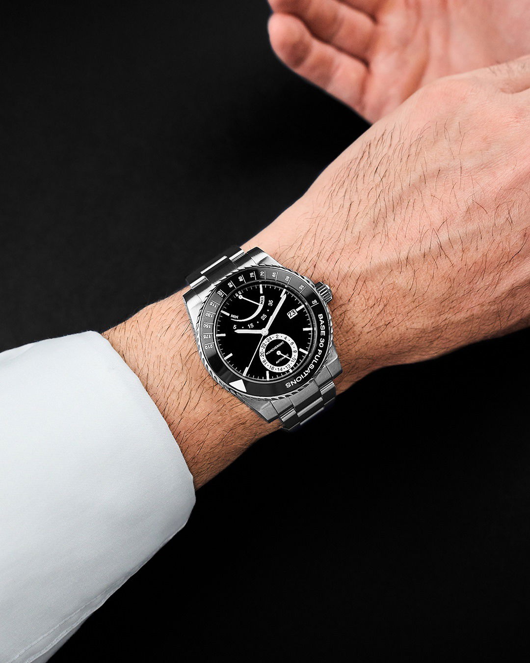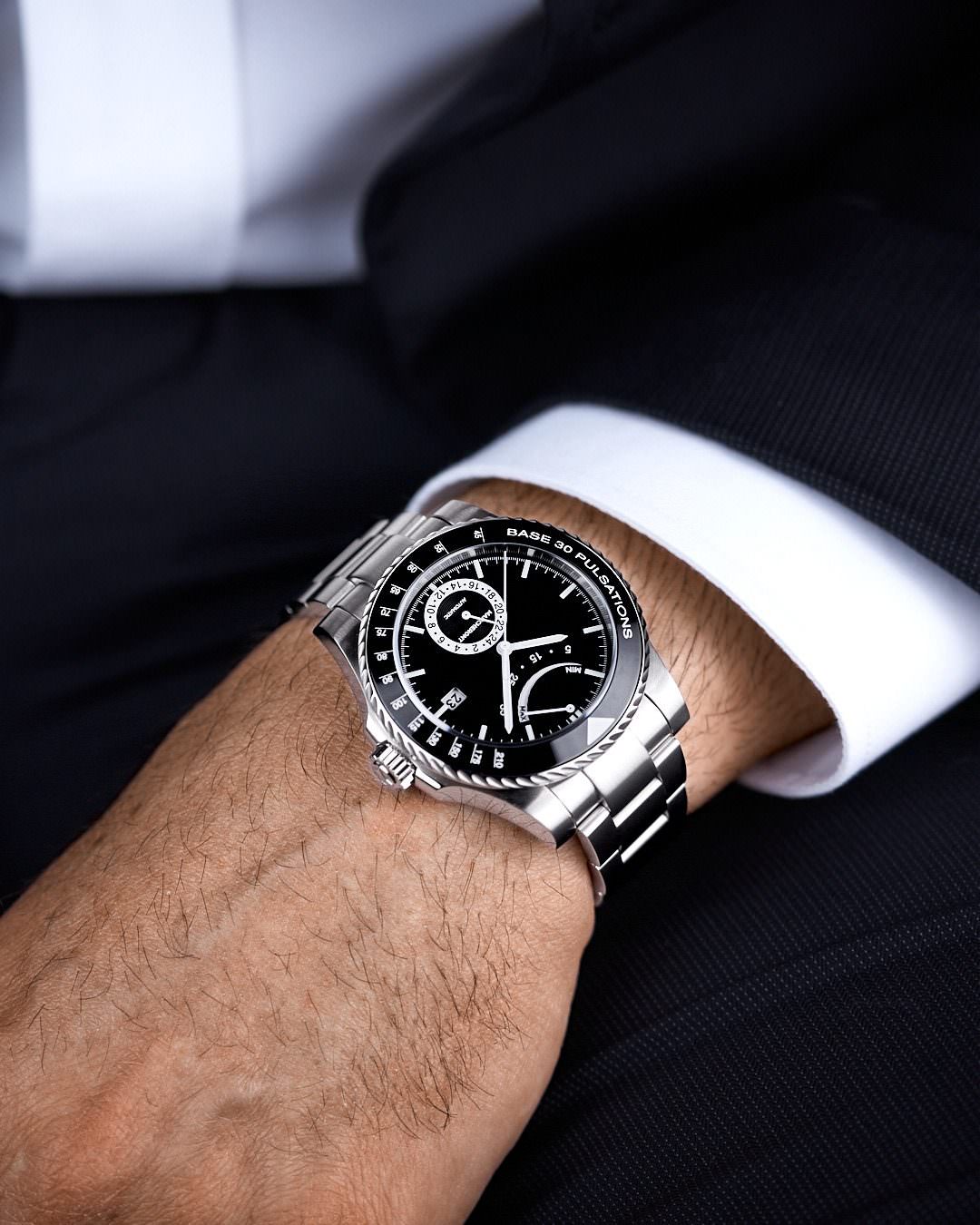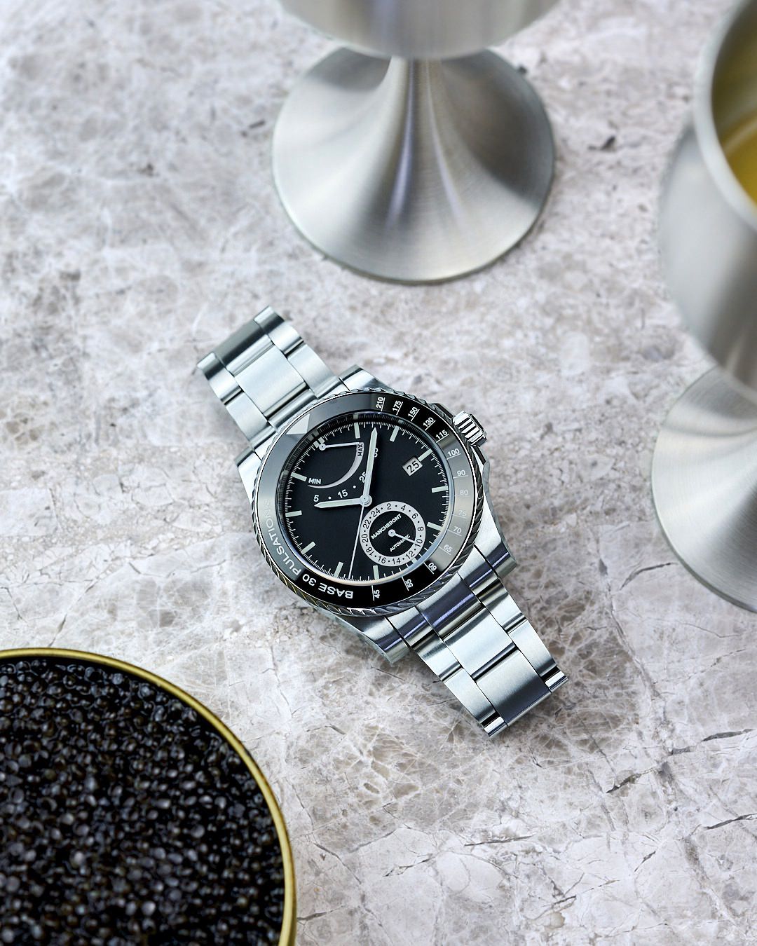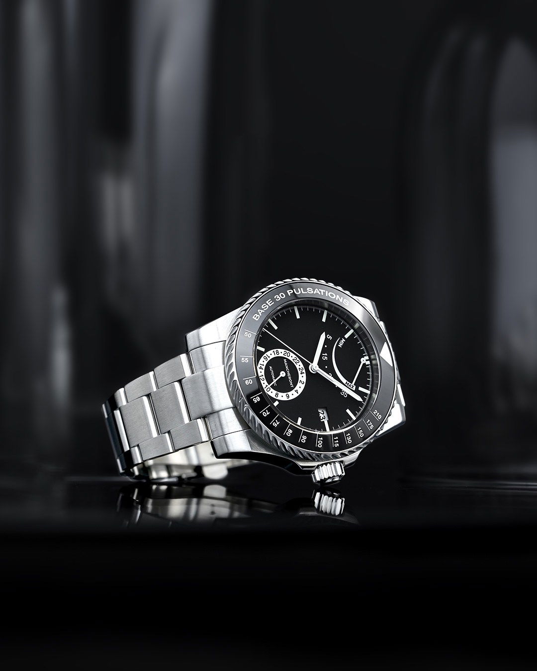 Mancheront introduces the Pacer Black, a contemporary take on the pulsometer watch. This stylish timepiece lets you check your heart rate analogically by rotating the bezel. It simplifies heart rate monitoring by using a pulsometer scale on the dial on a rotatable bezel calibrated for 30 pulsations. The Pacer Black focuses on essentials, forgoing a chronograph for a pulsometer-equipped rotating bezel. Its 316L stainless steel case is 41mm in diameter and comes with a robust 20mm lug-width stainless steel bracelet.