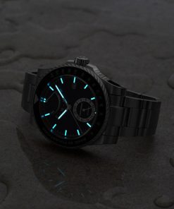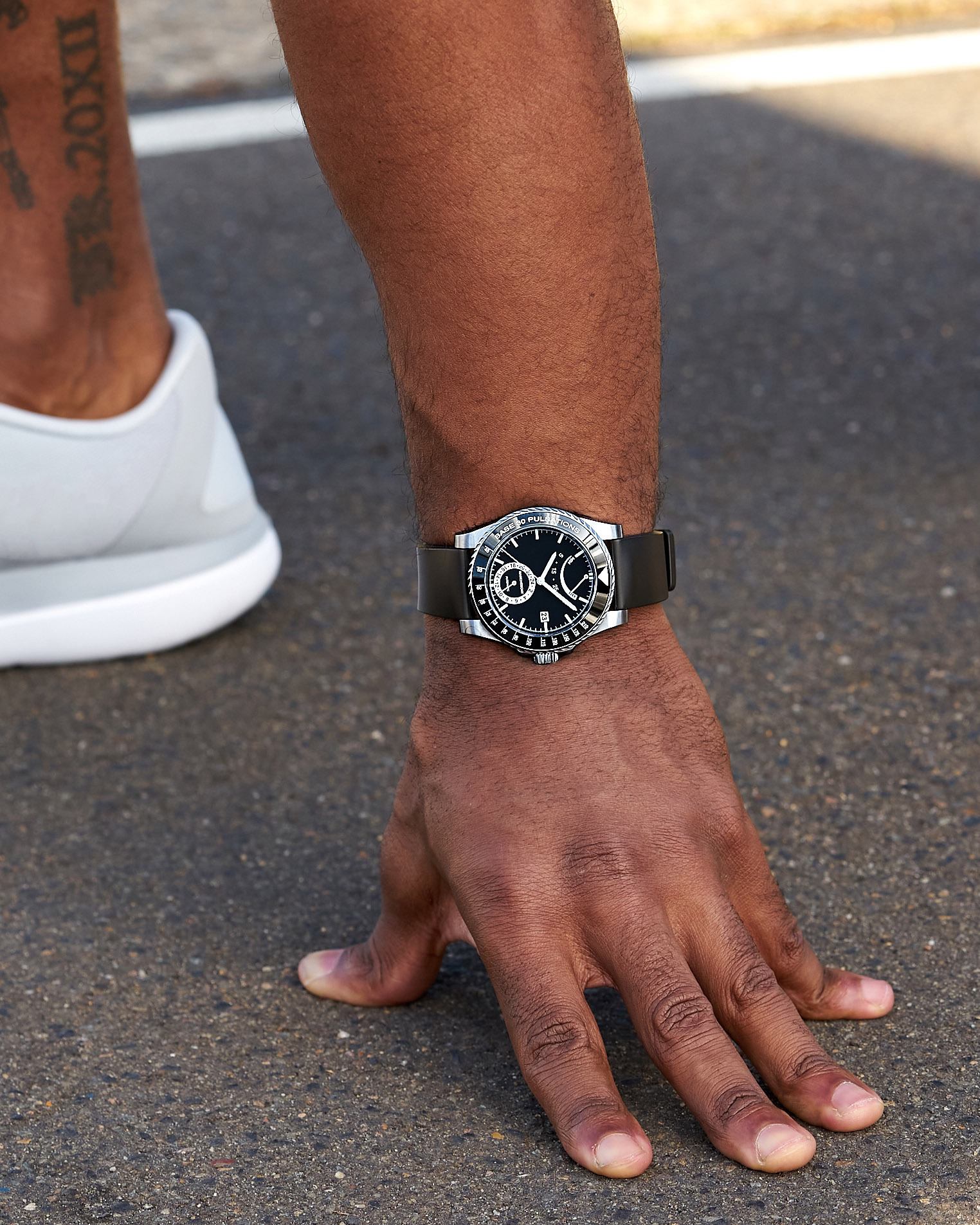 The dial of the Pacer Black is clean and legible, featuring a 24-hour dial at 6 o’clock and a power reserve indicator at 12 o’clock, with C3 blue Super-LumiNova for nighttime visibility. These additions are powered by the reliable Citizen Miyota 9132 automatic movement, boasting a 40-hour power reserve, quickset date adjustment, and hacking. The Pacer Black also includes a sapphire crystal with an anti-reflective coating, a screw-down crown, and 100m water resistance.