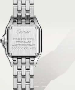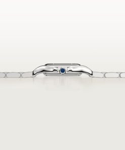 Panthère de Cartier watch, small model, quartz movement. Case in steel, dimensions: 23 mm x 30 mm, thickness: 6 mm, crown set with a synthetic blue spinel, silvered dial, blued-steel sword-shaped hands, steel bracelet. Water-resistant to 3 bar (approx. 30 meters).