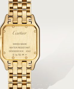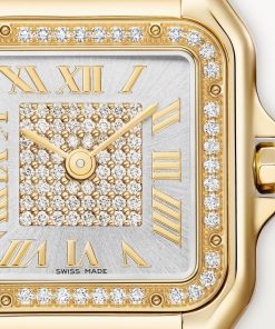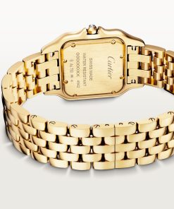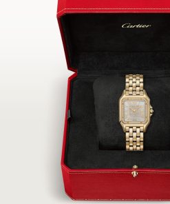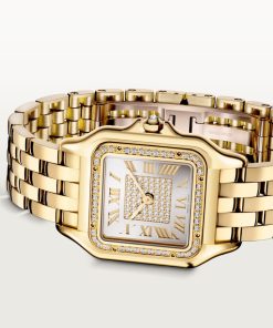 Panthère de Cartier watch, medium model, quartz movement. 18K yellow gold (750/1000) case set with 44 brilliant-cut diamonds totaling 0.28 carats. Dimensions: 36.5 mm x 26.7 mm, thickness: 6.8 mm. 18K yellow gold (750/1000) octagonal crown set with a brilliant-cut diamond totaling 0.02 carats. Silvered sunray-brushed dial set with 60 brilliant-cut diamonds totaling 0.22 carats, golden-finish sword-shaped hands. 18K yellow gold (750/1000) bracelet. Water-resistant up to 3 bar (approx. 30 meters/100 feet).