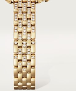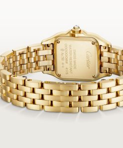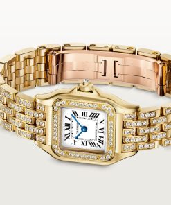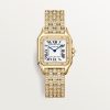 Panthère de Cartier watch, small model, quartz movement. 18K yellow gold (750/1000) case set with 36 brilliant-cut diamonds totaling 0.25 carats. Dimensions: 30.3 mm x 22 mm, thickness: 6.05 mm. 18K yellow gold (750/1000) octagonal crown set with a brilliant-cut diamond totaling 0.02 carats. Silvered dial, blued-steel sword-shaped hands. 18K yellow gold (750/1000) bracelet, semi-set with 142 brilliant-cut diamonds totaling 1.29 carats. Water-resistant up to 3 bar (approx. 30 meters/100 feet).