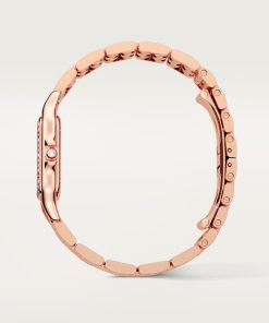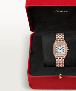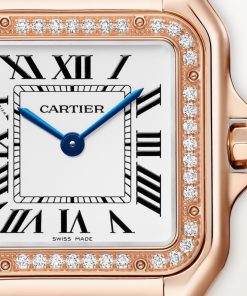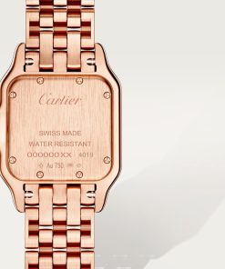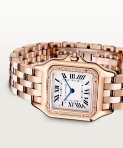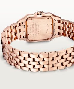 Panthère de Cartier watch, medium model, quartz movement. Case in rose gold 750/1000 set with brilliant-cut diamonds, dimensions: 27 mm x 36 mm, thickness: 6 mm, crown set with a diamond, silvered dial, blued-steel sword-shaped hands, rose gold 750/1000 bracelet. Water-resistant to 3 bar (approx. 30 meters).