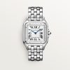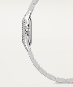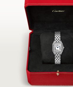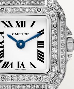 Panthère de Cartier watch, mini model, quartz movement. Rhodiumized white gold 750/1000 case set with brilliant-cut diamonds. Rhodiumized white gold 750/1000 octagonal crown set with a brilliant-cut diamond. Silver dial, blued-steel sword-shaped hands, sapphire crystal. Bracelet in rhodiumized white gold 750/1000. Case dimensions: 25 mm x 20 mm, thickness: 6 mm. Water-resistant up to 3 bar (approx. 30 meters/100 feet).