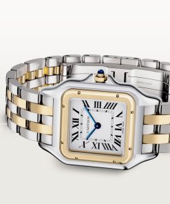 Panthère de Cartier watch, medium model, quartz movement. Case in yellow gold 750/1000 and steel, dimensions: 29 mm x 37 mm, thickness: 6 mm, crown set with a synthetic blue spinel, silvered dial, blued-steel sword-shaped hands, bracelet in yellow gold 750/1000 and steel. Water-resistant to 3 bar (approx. 30 meters).