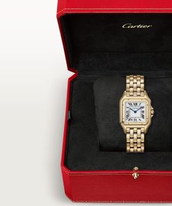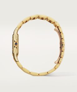 Panthère de Cartier watch, medium model, quartz movement. Case in yellow gold 750/1000, dimensions: 29 mm x 37 mm, thickness: 7 mm, crown set with a blue sapphire, silvered dial, blued-steel sword-shaped hands, yellow gold 750/1000 bracelet. Water-resistant to 3 bar (approx. 30 meters).