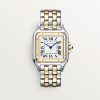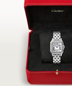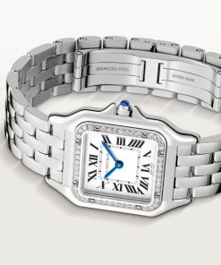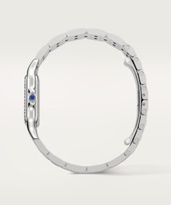 Panthère de Cartier watch, medium model, quartz movement. Steel case, bezel set with 44 brilliant-cut diamonds totaling 0.28 carat. Case dimensions: 36.5 mm x 26.7 mm, thickness: 6 mm. Octagonal crown set with a blue synthetic spinel, silvered dial, blued-steel sword-shaped hands, steel bracelet. Water-resistant up to 3 bar (approx. 30 meters/100 feet).
