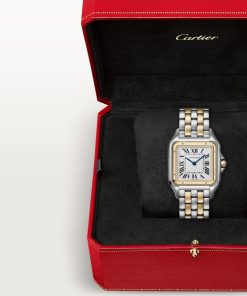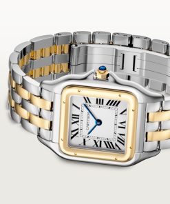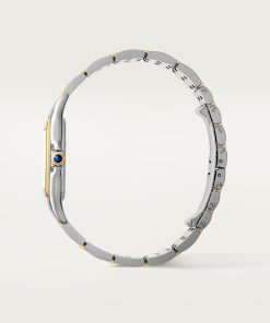 Panthère de Cartier watch, large model, quartz movement. 18K yellow gold (750/1000) and steel case, dimensions: 31 mm x 42 mm, thickness: 6.71 mm, crown with a blue synthetic spinel, silvered dial, blued-steel sword-shaped hands, 18K yellow gold (750/1000) and steel bracelet. Water-resistant up to 3 bar (approx. 30 meters/100 feet).