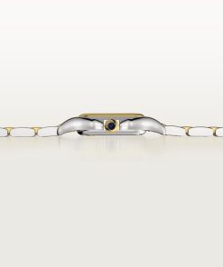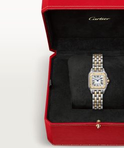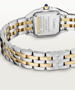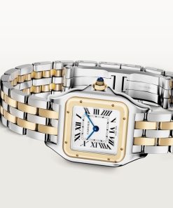 Panthère de Cartier watch, small model, quartz movement. Case in yellow gold 750/1000 and steel, dimensions: 23 mm x 30 mm, thickness: 6 mm, crown set with a synthetic blue spinel, silvered dial, blued-steel sword-shaped hands, bracelet in yellow gold 750/1000 and steel. Water-resistant to 3 bar (approx. 30 meters).