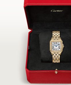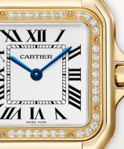 Panthère de Cartier watch, medium model, quartz movement. Case in yellow gold 750/1000 set with brilliant-cut diamonds, dimensions: 27 mm x 36 mm, thickness: 6 mm, crown set with a diamond, silvered dial, blued-steel sword-shaped hands, yellow gold 750/1000 bracelet, water-resistant to 3 bar (approx. 30 meters).