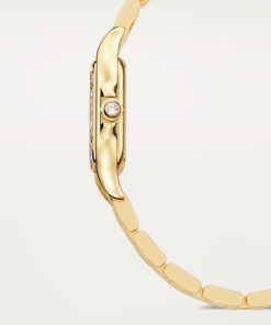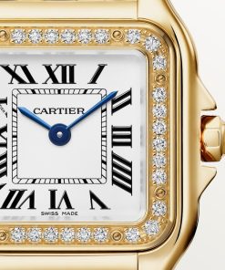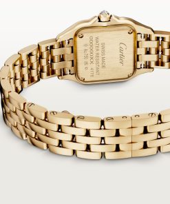 Panthère de Cartier watch, small model, quartz movement. Case in 18K yellow gold (750/1000) set with brilliant-cut diamonds, dimensions: 22 mm x 30 mm, thickness: 6 mm, crown set with a diamond, silvered dial, blued-steel sword-shaped hands, 18K yellow gold (750/1000) bracelet, water-resistant to 3 bar (approx. 30 meters).