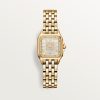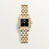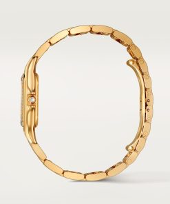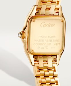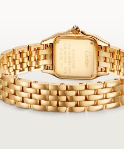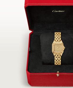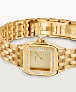 Panthère de Cartier watch, small model, quartz movement. 18K yellow gold (750/1000) case set with 37 brilliant-cut diamonds totaling 0.26 carats. Dimensions: 22 mm x 30 mm, thickness: 6 mm. 18K yellow gold (750/1000) octagonal crown set with a brilliant-cut diamond totaling 0.02 carats. Golden grained dial with sparkling effect, gold-finish sword-shaped hands, textured 18K yellow gold (750/1000) bracelet. Water-resistant up to 3 bar (approx. 30 meters/100 feet).