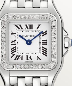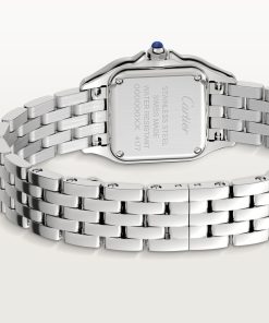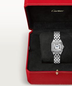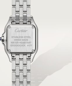 Panthère de Cartier watch, small model, quartz movement. Case in steel, bezel set with brilliant-cut diamonds, dimensions: 23 mm x 30 mm, thickness: 6 mm, crown set with a synthetic blue spinel, silvered dial, blued-steel sword-shaped hands, steel bracelet, water-resistant to 3 bar (approx. 30 meters).