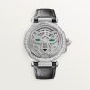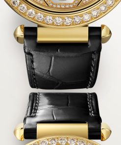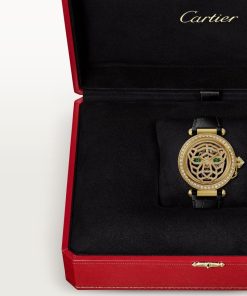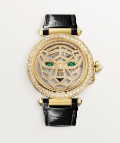 Pasha de Cartier skeleton watch with panther decor, 41 mm, Manufacture mechanical movement with manual winding, caliber 9625 MC. 18K yellow gold (750/1000) case and bezel set with 45 brilliant-cut diamonds totaling 2.05 carats, 18K yellow gold (750/1000) dial, skeleton movement with panther decor set with 341 brilliant-cut diamonds totaling 0.67 carats, marquise-cut emerald eyes and onyx nose, 18K yellow gold (750/1000) crown set with a 0.36-carat brilliant-cut diamond, golden steel diamond-shaped hands, sapphire crystal, semi-matte black calfskin strap, second strap in shiny black alligator leather, 18K yellow gold (750/1000) ardillon buckle set with 46 brilliant-cut diamonds totaling 0.29 carats. Thickness: 9.9 mm. Water-resistant up to 3 bar (approx. 30 meters/100 feet).