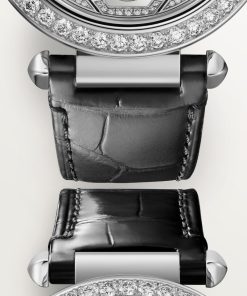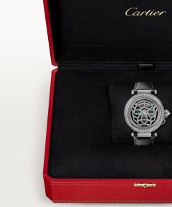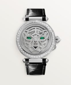 Pasha de Cartier skeleton watch with panther decor, 41 mm, Manufacture mechanical movement with manual winding, caliber 9625 MC. Rhodiumized 18K white gold (750/1000) case and bezel set with 45 brilliant-cut diamonds totaling 2.05 carats, rhodiumized 18K white gold (750/1000) dial, skeleton movement with panther decor set with 341 brilliant-cut diamonds totaling 0.67 carats, marquise-cut emerald eyes and onyx nose, rhodiumized 18K white gold (750/1000) crown set with a 0.36 carat brilliant-cut diamond, steel diamond-shaped hands, sapphire crystal, semi-matte dark gray alligator leather strap, second strap in shiny black alligator leather, rhodiumized 18K white gold (750/1000) deployant buckle set with 46 brilliant-cut diamonds totaling 0.29 carats. Thickness: 9.9 mm. Water-resistant up to 3 bar (approx. 30 meters/100 feet).