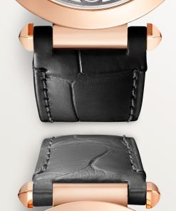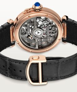 Pasha de Cartier watch, 41 mm, skeleton, mechanical movement with automatic winding, caliber 9624 MC. 18K rose gold (750/1000) case, fluted crown cap and crown set with sapphires. Hours and minutes with skeletonized bridges forming Arabic numerals. Diamond-shaped hands. 2 alligator-skin straps, one black and one dark gray, with QuickSwitch interchangeable system, 18K rose gold (750/1000) folding buckle.