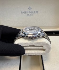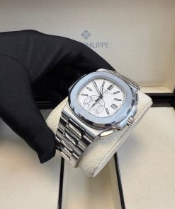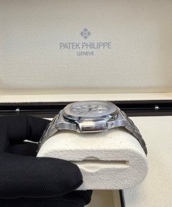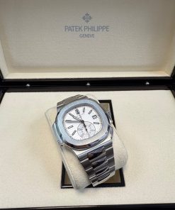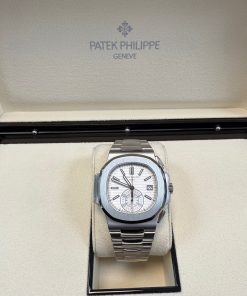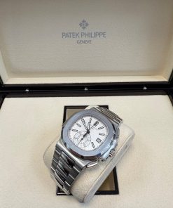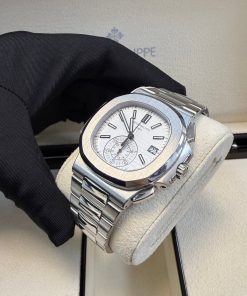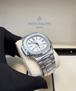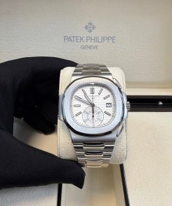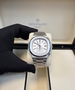 Patek Philippe Nautilus Chronograph (ref. 5980/1A), featuring a mechanical automatic movement; white dial; chronograph complication with 60-minute and 12-hour counters together in a single elegant monocounter at 6 o’clock; date display at 3 o’clock; center sweep seconds hand, which also serves as the chronograph hand; and 40.5mm, stainless steel case with an integrated stainless steel, Nautilus-style bracelet.