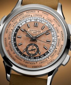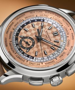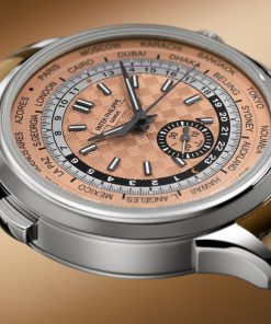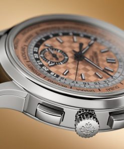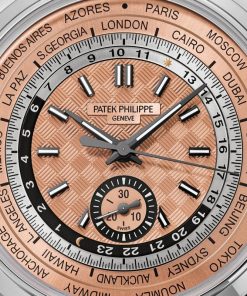 As the first stainless steel version of a cult model, the new Ref. 5935A-001 self-winding World Time flyback chronograph stands out with its sporty vintage looks. The carbon motif in the center of the opaline rose gilt dial reflects a modern, dynamic spirit.