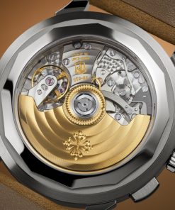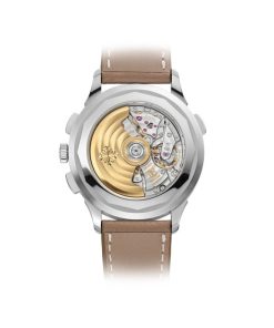 This watch is delivered with two calfskin straps – one in grained taupe and the other in beige with a nubuck finish.