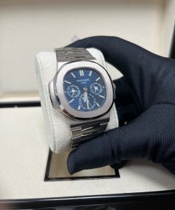 40mm 18K white gold case, 8.42 mm thick, blue sunburst dial with gold applied luminescent hour markers, caliber 240 Q self-winding movement with perpetual calendar, moon phases, day, date, month, leap year, and 24-hour indication by hands, approximately 38-48 hours of power reserve, 18K white gold bracelet, fold-over buckle. Water-resistant to 60 m. Patek Philippe’s thinnest perpetual calendar.