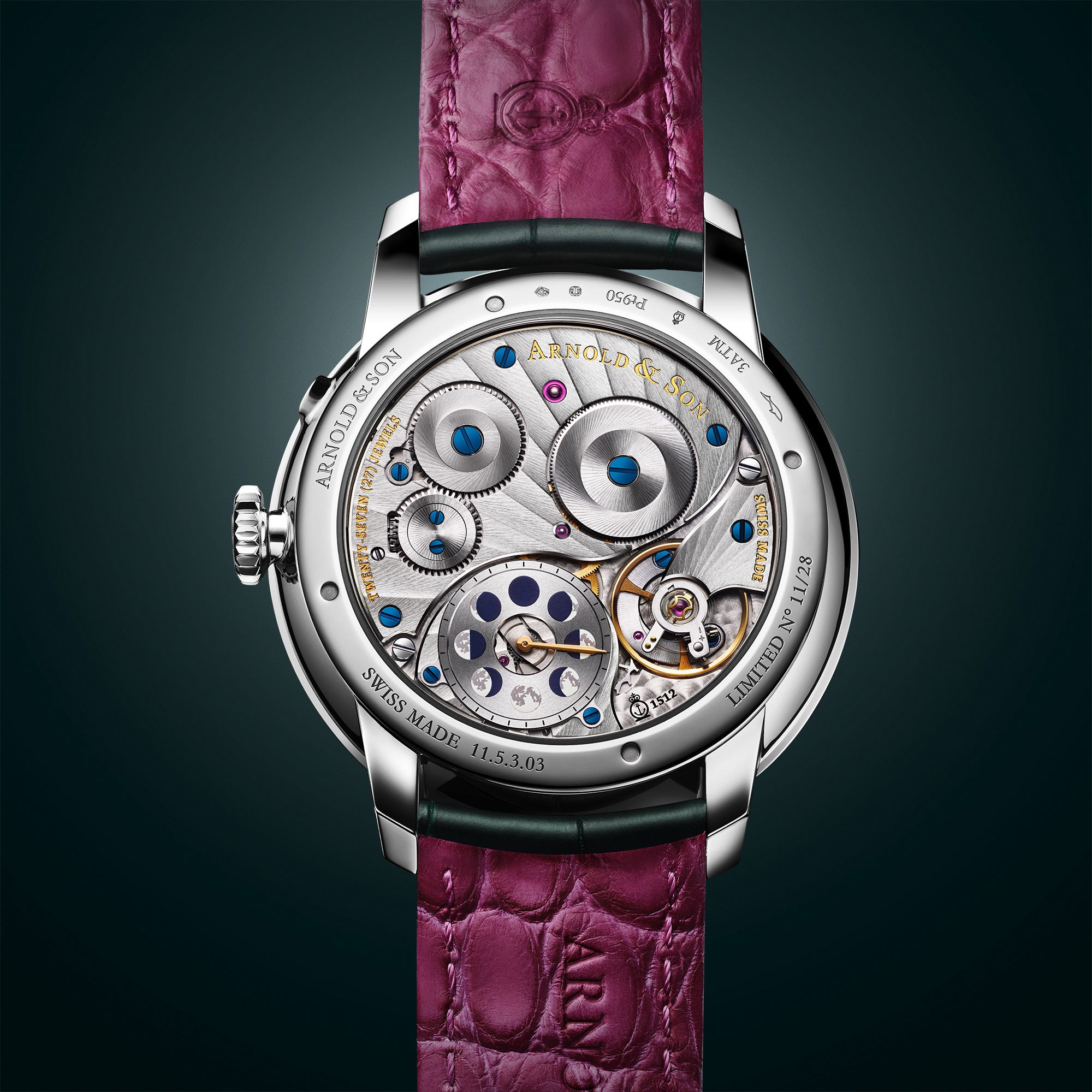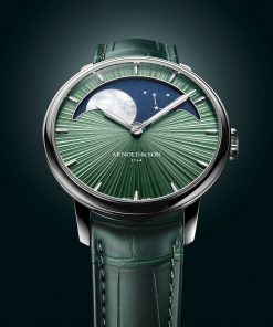 The Arnold & Son Perpetual Moon 41.5 Platinum “Fern Green” edition is a stunning tribute to moonlight and fine watchmaking. Limited to just 28 pieces, it pairs the cool tones of platinum, fern green, and midnight blue to create a striking design.