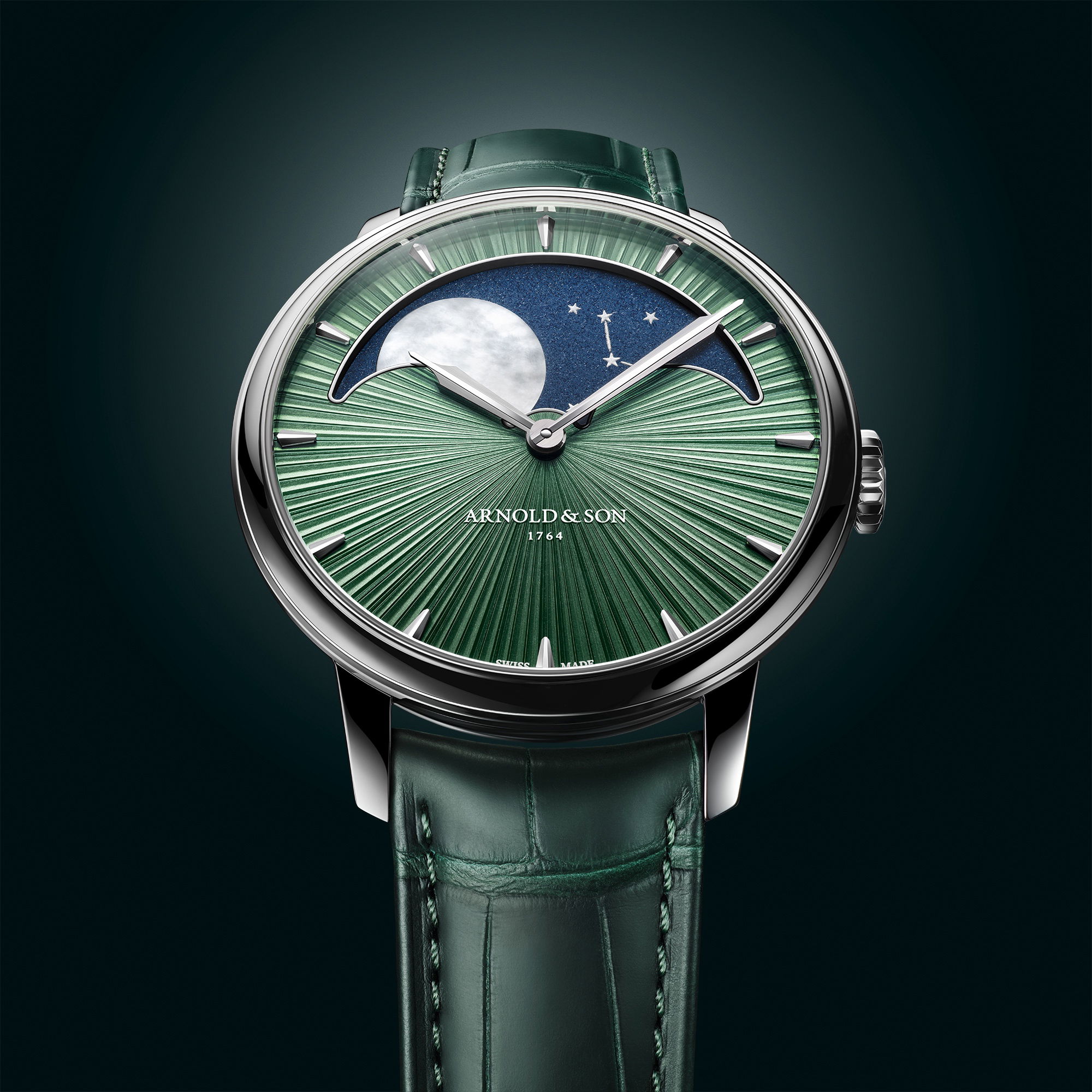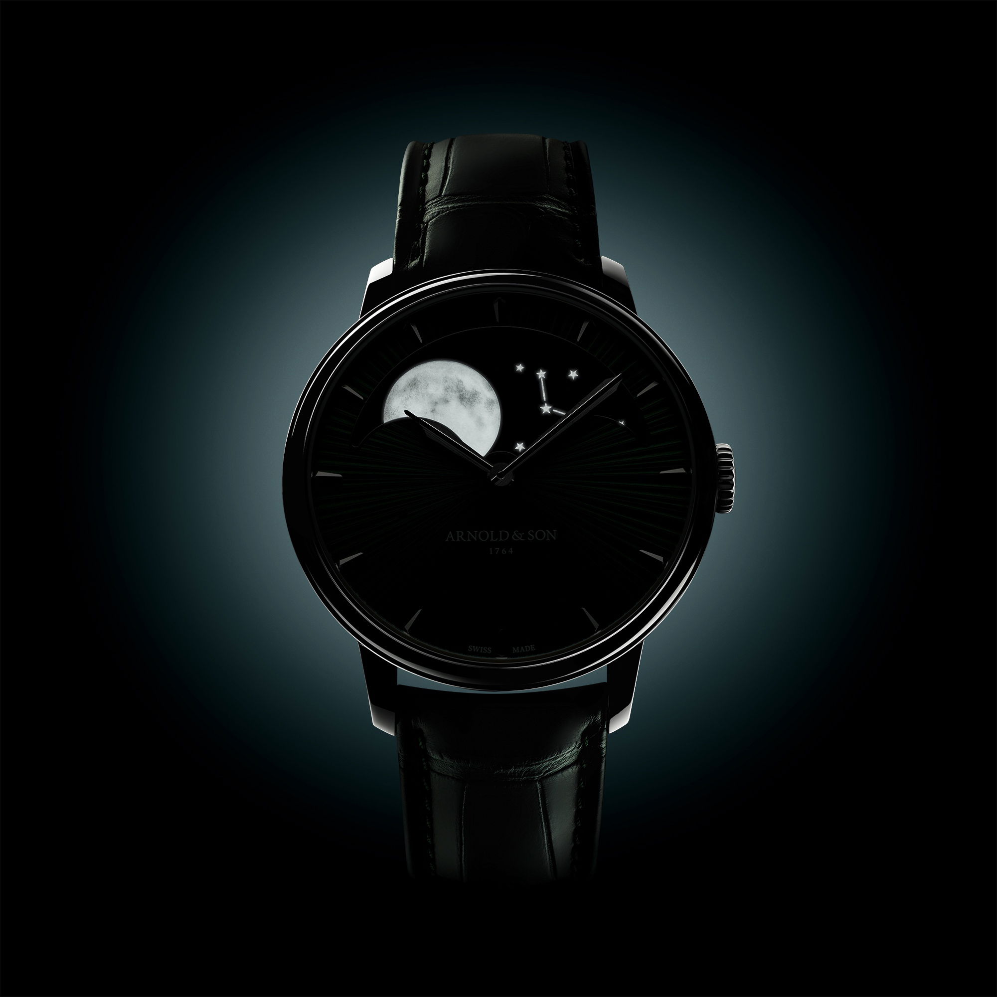 Adding to its celestial theme, the hand-painted constellations of Ursa Major and Cassiopeia, enhanced with luminous material, surround the moon. These elements honor Arnold’s maritime legacy, with Polaris, the North Star, reflecting its historic role in navigation.