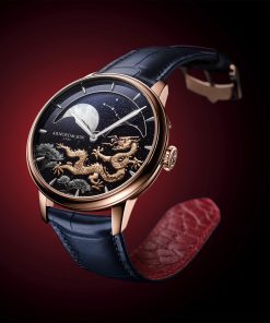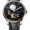 The Perpetual Moon 41.5 Red Gold “Year of the Dragon” introduces a new limited “Chinese Zodiac” series, where each of the two versions showcases a large moon casting its glow over a garden at night, accompanied by a gracefully sculpted rose gold dragon. The dial’s aventurine glass, sparkling with metallic inclusions, creates the illusion of a starry sky, complemented by stone pines that mirror the dragon’s sinuous form.