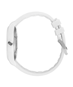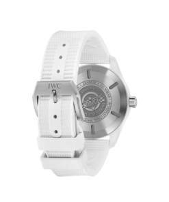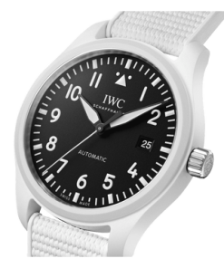 The Pilot’s Watch Automatic 41 TOP GUN Lake Tahoe features a case made of striking white ceramic, a black dial with white numerals and indices and a white rubber strap.