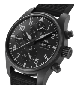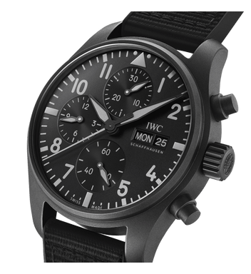 A case, crown and pushers made of IWC’s developed material Ceratanium® lend the Pilot’s Watch Chronograph 41 TOP GUN Ceratanium® an all-black design.