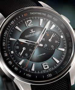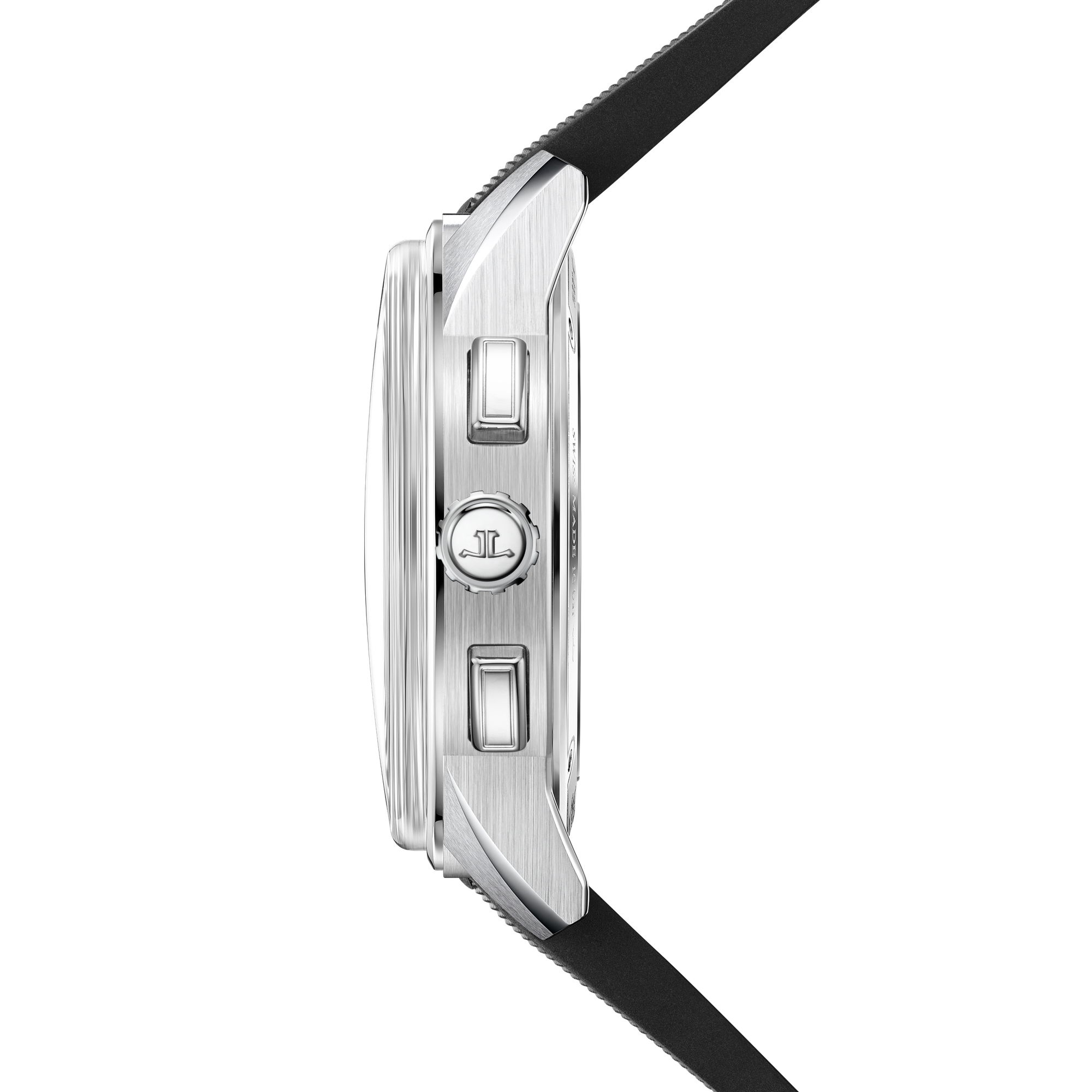The 42 millimeter stainless steel case channels the spirit of Jaeger-LeCoultre’s 1960s diving watches with taut lines, faceted lugs, a slim bezel, and a domed glass-box crystal. The large crown and broad pushers offer both visual punch and tactile feedback, referencing the collection’s heritage while delivering modern wearability. With two quick-change strap options in blue-grey canvas and textured black rubber, the watch shifts easily from the office to open water.