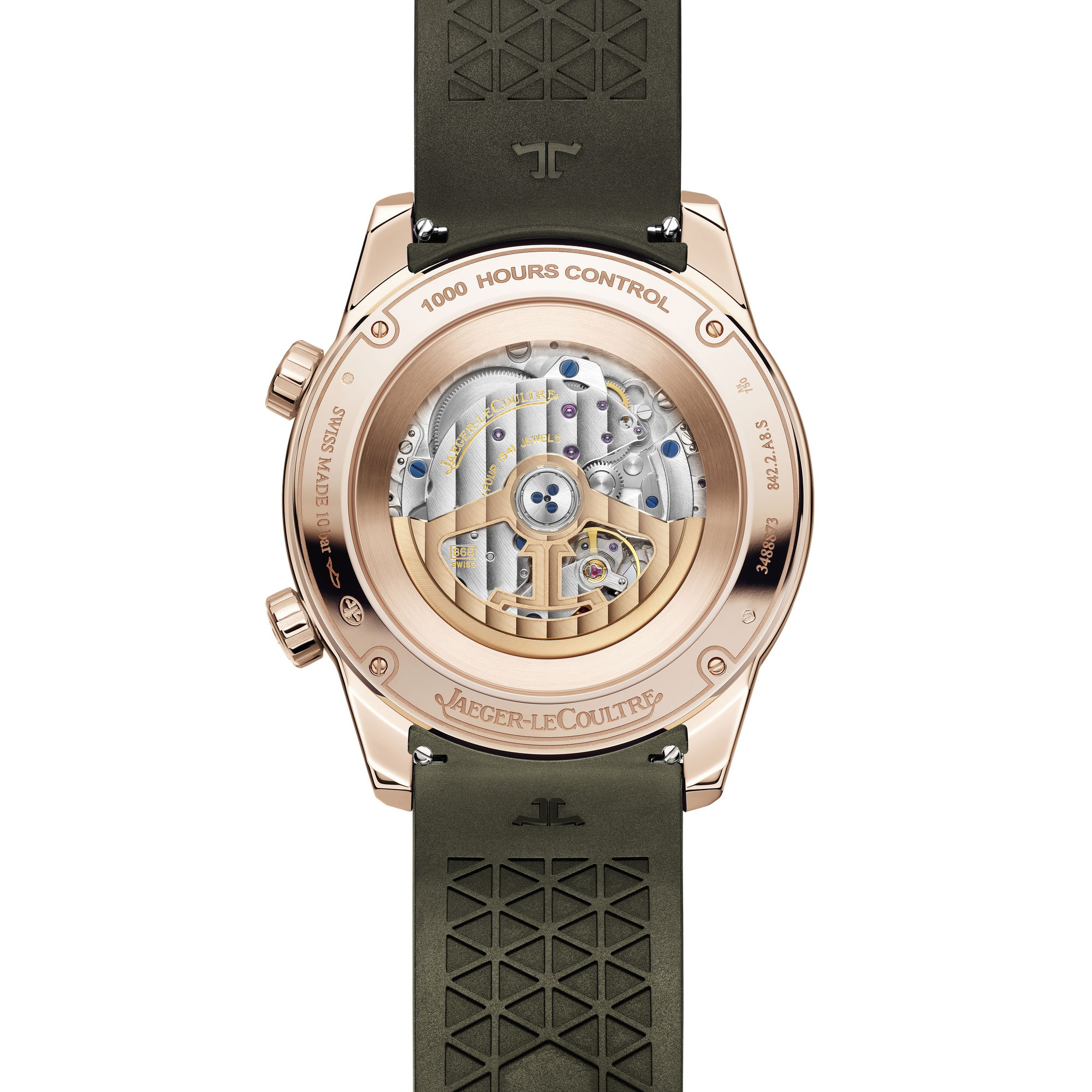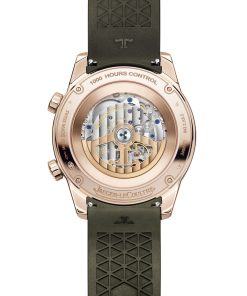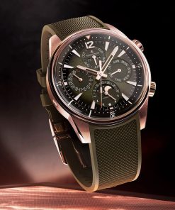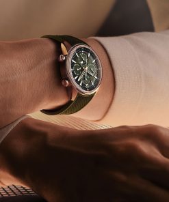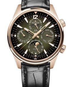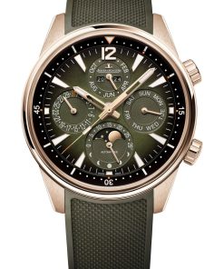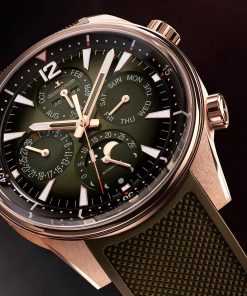 The watch emphasizes symmetry and legibility with three sub-dials displaying the date, day, and month, with a moon-phase display at 6 o’clock, showing the moon’s age and phases in both hemispheres. The 42mm pink gold case includes an interchangeable strap system, allowing for quick changes between a black alligator strap for a formal look and a textured dark green rubber strap for a sporty style.