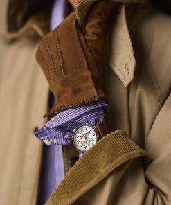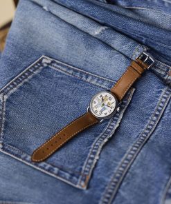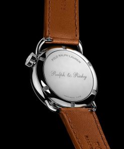 At its heart, the watch is powered by the Swiss-made RL200 caliber movement. Beating at 28,800 vibrations per hour, this automatic movement features 26 jewels and a power reserve of approximately 38 hours. Encased in polished stainless steel with a crisp white dial, the 38mm case is paired with a beige calfskin strap that is easily interchangeable. The case back, engraved with “Ralph & Ricky,” completes the piece with a personal touch.