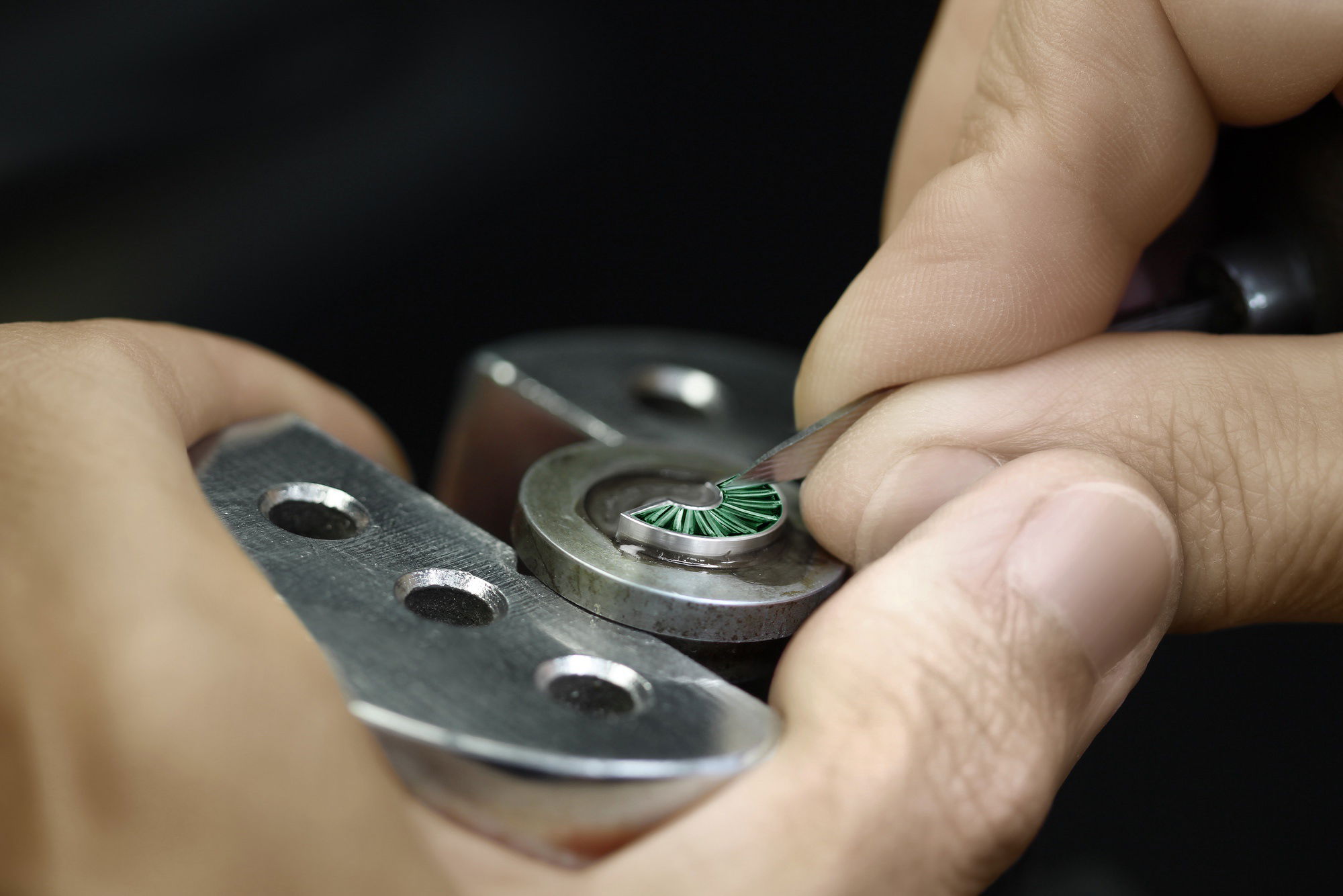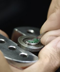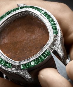 The Piaget Polo Emperador Skeleton Tourbillon High Jewellery watch is an exquisite and rare timepiece, distinguished by its radiant combination of emeralds and diamonds. Born in Piaget’s High Jewellery workshops, the watch showcases the legacy of the brand’s dedication to superior jewellery craftsmanship dating back to 1959. Notably, the 1270D movement, an opulent rendition of previous automatic tourbillons, is intricately adorned with diamonds. This involves meticulous attention to detail, demanding over 140 hours of work to ensure every diamond and precious material fits perfectly. The movement and case alone take 100 hours, with an additional 40 hours to set diamonds on the tourbillon. The dial boasts a captivating oscillating weight adorned with trapeze-cut emeralds and a signature ‘P’ marking the seconds on the flying tourbillon. This 49mm Piaget Polo watch, available in various gem settings, echoes the brand’s unique synthesis of watchmaking and jewellery craftsmanship.