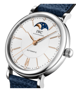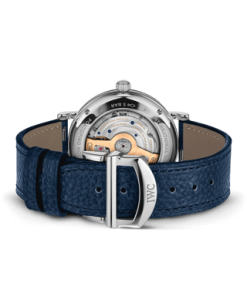 The Portofino Automatic Moon Phase 37 features the IWC-manufactured 32800 caliber and a see-through sapphire glass back displaying the movement.