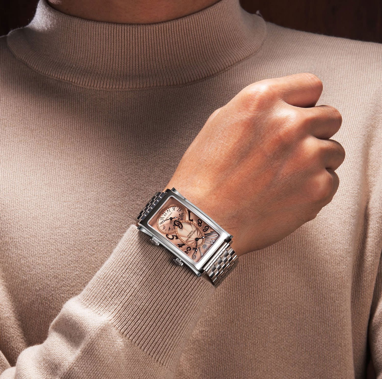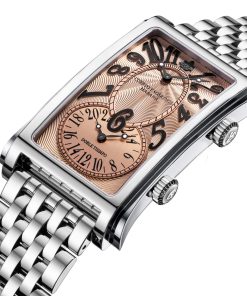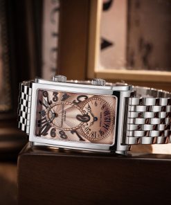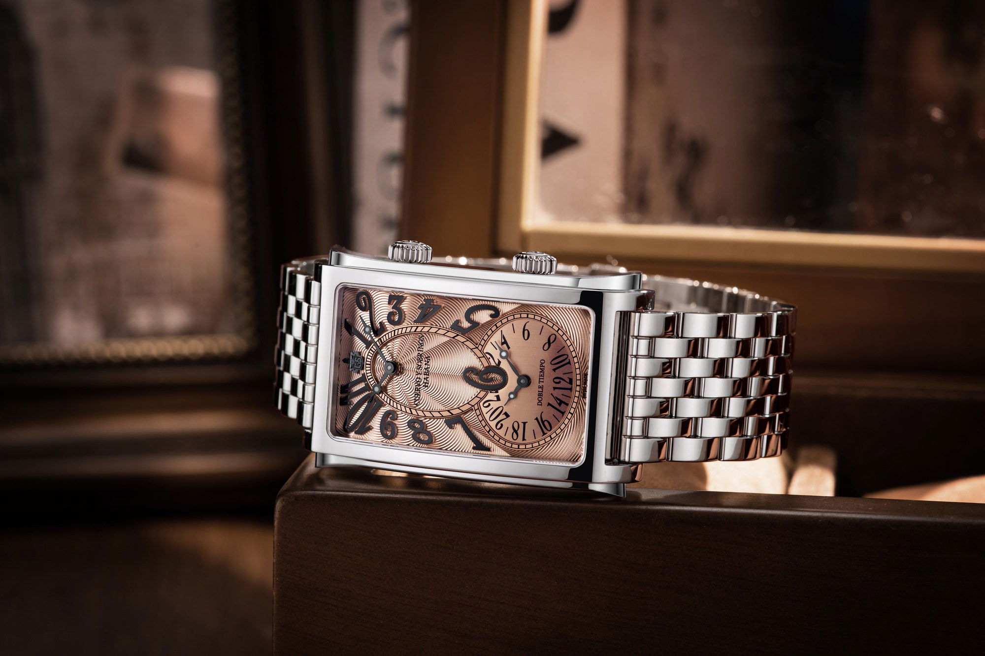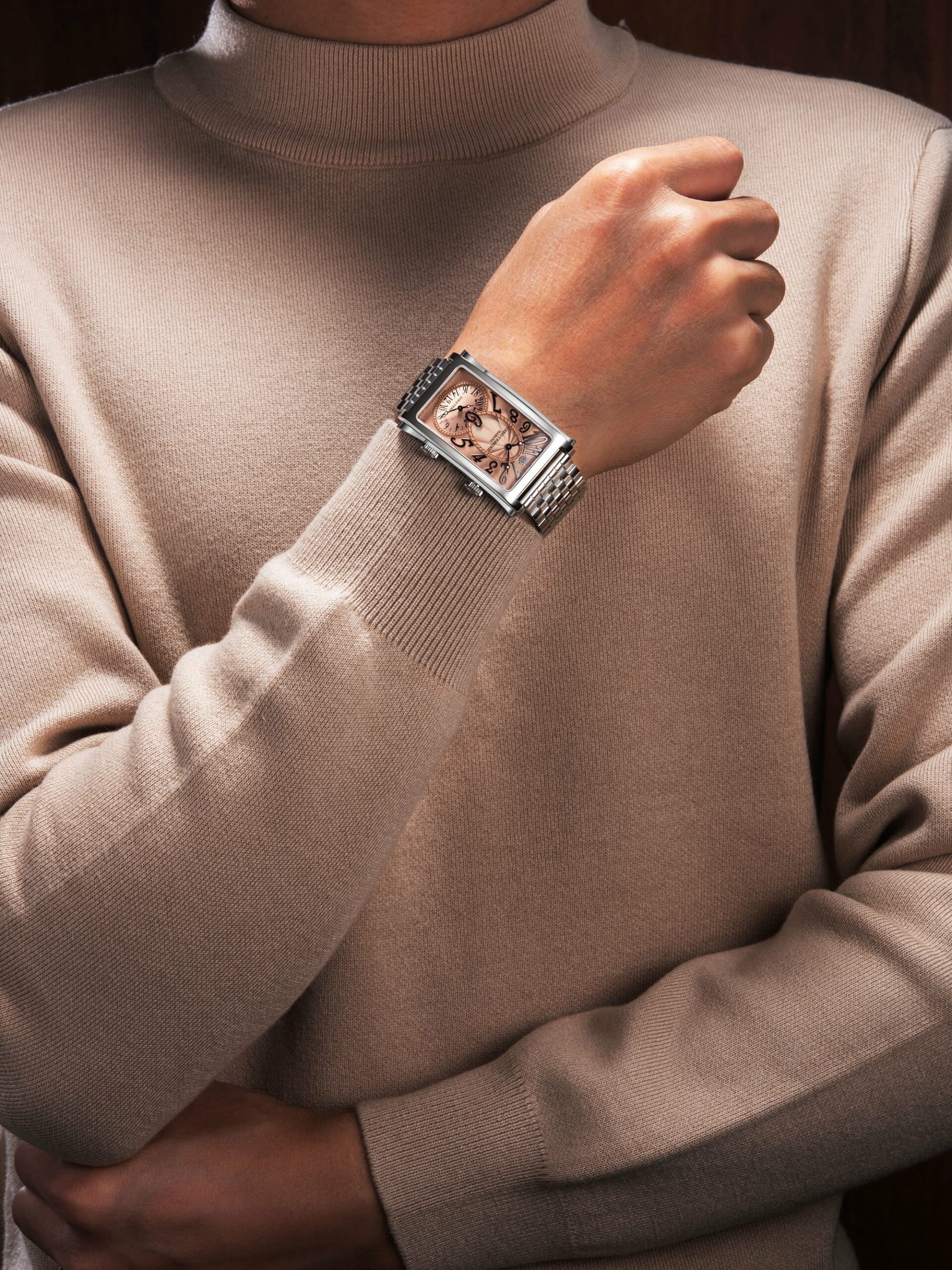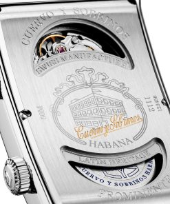Inspired by Art Deco and the architecture of Havana, where the brand originated, the watch features subtle design enhancements for an elegant look. The dial, reminiscent of a Cuban sunset, features salmon colors with luminescent hands and Arabic numerals. Inside, two Swiss automatic movements power the watch, each with its own distinctive features.