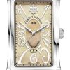 The Prominente Prominente Icónico Prominente Iconico Solo Tiempo comes in an imposing stainless steel case featuring rhodium-plated hour and minute hands, clearly indicating the time. Alongside these, there’s a central sweep seconds hand and a date display, offering only the essential functions for timekeeping. The design of the Prominente Icónico prioritizes clarity and elegance, with its elongated case blending intricate curves with sharp lines. The stepped sides of the case are noticeable from the front, while the smooth curves become apparent when viewed from the side, giving it a gentle profile. The dial features elaborate Arabic numerals of varying sizes, adding a touch of vintage charm. A chemin de fer encircles the dial, enhancing readability and providing a stylish separation from the case.