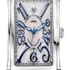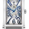 The Prominente Prominente Icónico Prominente Iconico Solo Tiempo comes in an imposing stainless steel case featuring rhodium-plated hour and minute hands, clearly indicating the time. Alongside these, there’s a central sweep seconds hand and a date display, offering only the essential functions for timekeeping. The design of the Prominente Icónico prioritizes clarity and elegance, with its elongated case blending intricate curves with sharp lines. The stepped sides of the case are noticeable from the front, while the smooth curves become apparent when viewed from the side, giving it a gentle profile. The dial features elaborate Arabic numerals of varying sizes, adding a touch of vintage charm. A chemin de fer encircles the dial, enhancing readability and providing a stylish separation from the case.