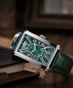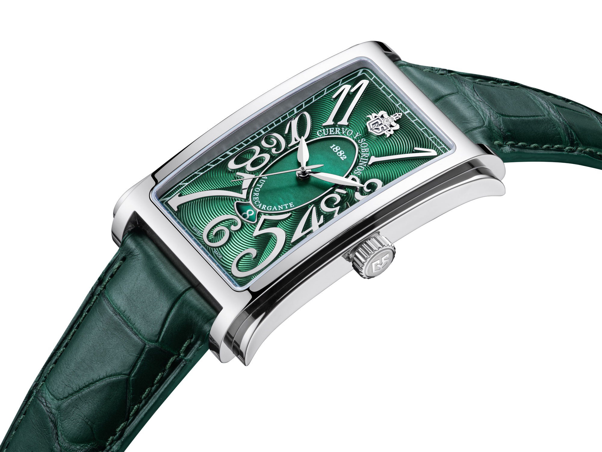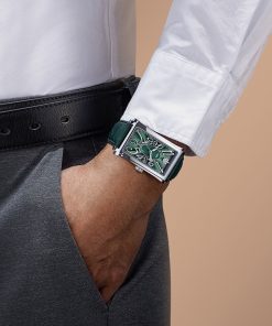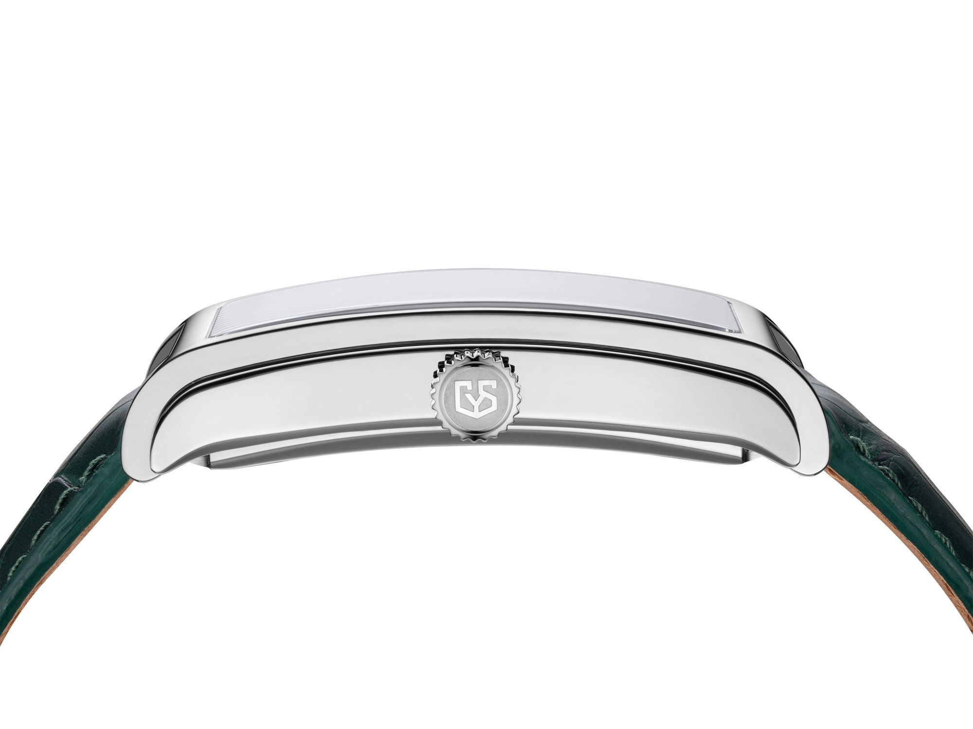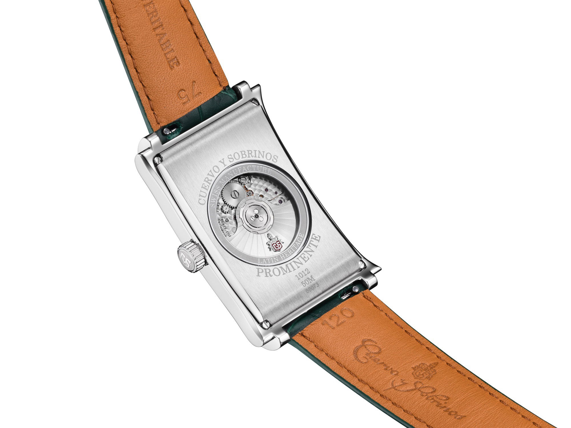 The Prominente Prominente Icónico comes in an imposing stainless steel case featuring rhodium-plated hour and minute hands, clearly indicating the time. Alongside these, there’s a central sweep seconds hand and a date display, offering only the essential functions for timekeeping. The design of the Prominente Icónico prioritizes clarity and elegance, with its elongated case blending intricate curves with sharp lines. The stepped sides of the case are noticeable from the front, while the smooth curves become apparent when viewed from the side, giving it a gentle profile. The dial features elaborate Arabic numerals of varying sizes, adding a touch of vintage charm. A chemin de fer encircles the dial, enhancing readability and providing a stylish separation from the case.