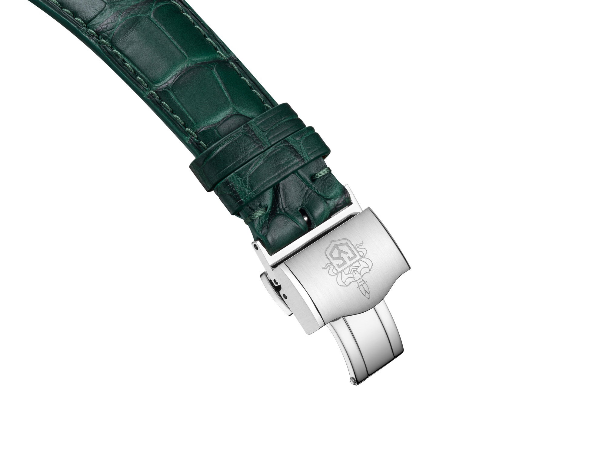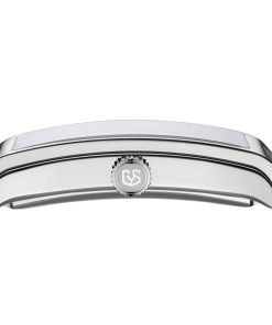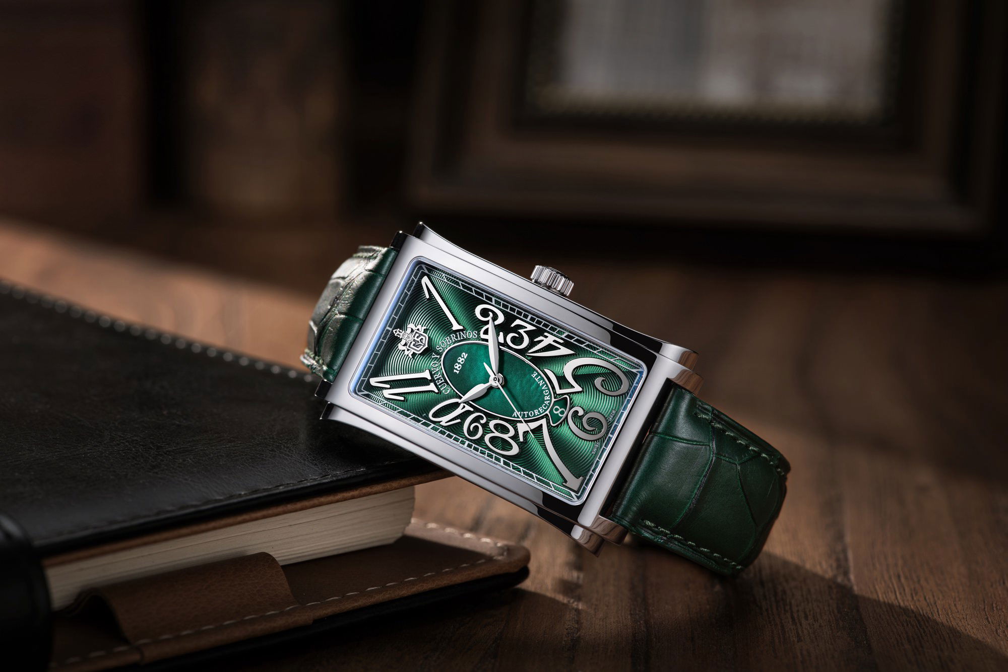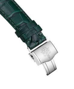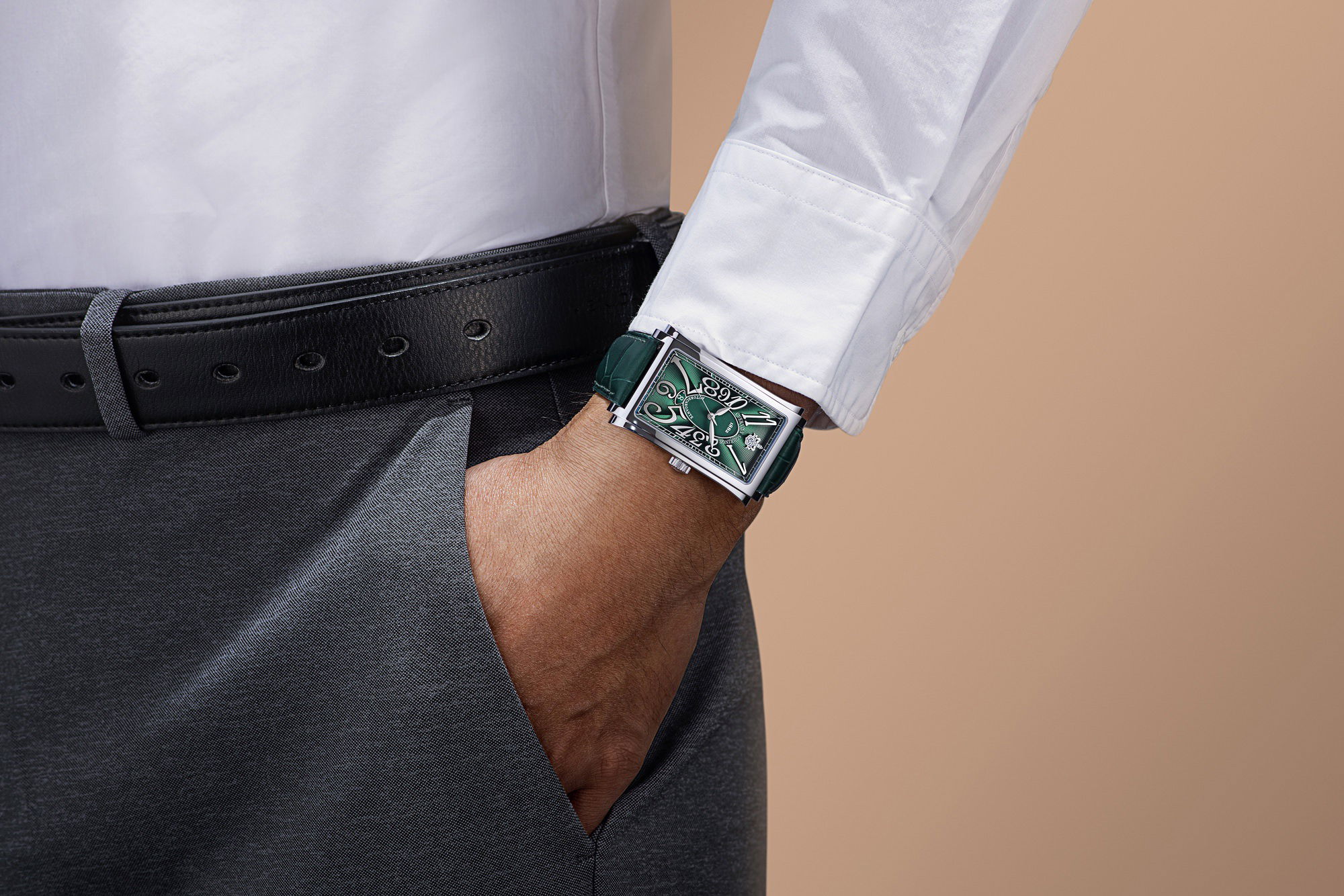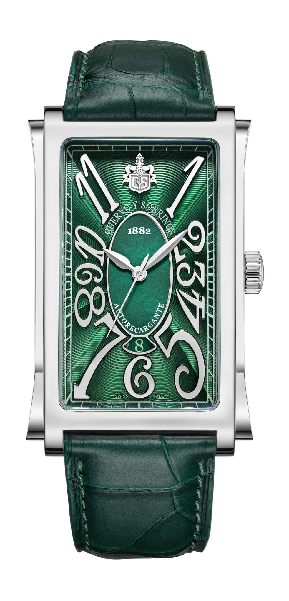 The Prominente Prominente Icónico comes in an imposing stainless steel case featuring rhodium-plated hour and minute hands, clearly indicating the time. Alongside these, there’s a central sweep seconds hand and a date display, offering only the essential functions for timekeeping. The design of the Prominente Icónico prioritizes clarity and elegance, with its elongated case blending intricate curves with sharp lines. The stepped sides of the case are noticeable from the front, while the smooth curves become apparent when viewed from the side, giving it a gentle profile. The dial features elaborate Arabic numerals of varying sizes, adding a touch of vintage charm. A chemin de fer encircles the dial, enhancing readability and providing a stylish separation from the case.